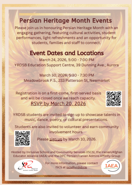Inclusive Schools and Community Services (ISCS), the Iranian/Afghan Educator Alliance (IAEA), and the OPC Persian/Iranian Admins Affinity Group will host Persian Heritage Month Events in March 2026.