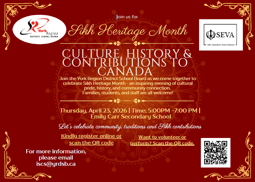 Inclusive Schools and Community Services (ISCS) and Sikh Educators Voice Alliance (SEVA) will be hosting a Sikh Heritage Month Event.