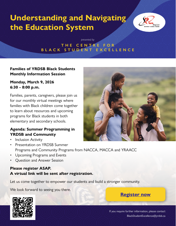For more information, please email the Centre for Black Student Excellence (CBSE) at blackstudentexcellence@yrdsb.ca.